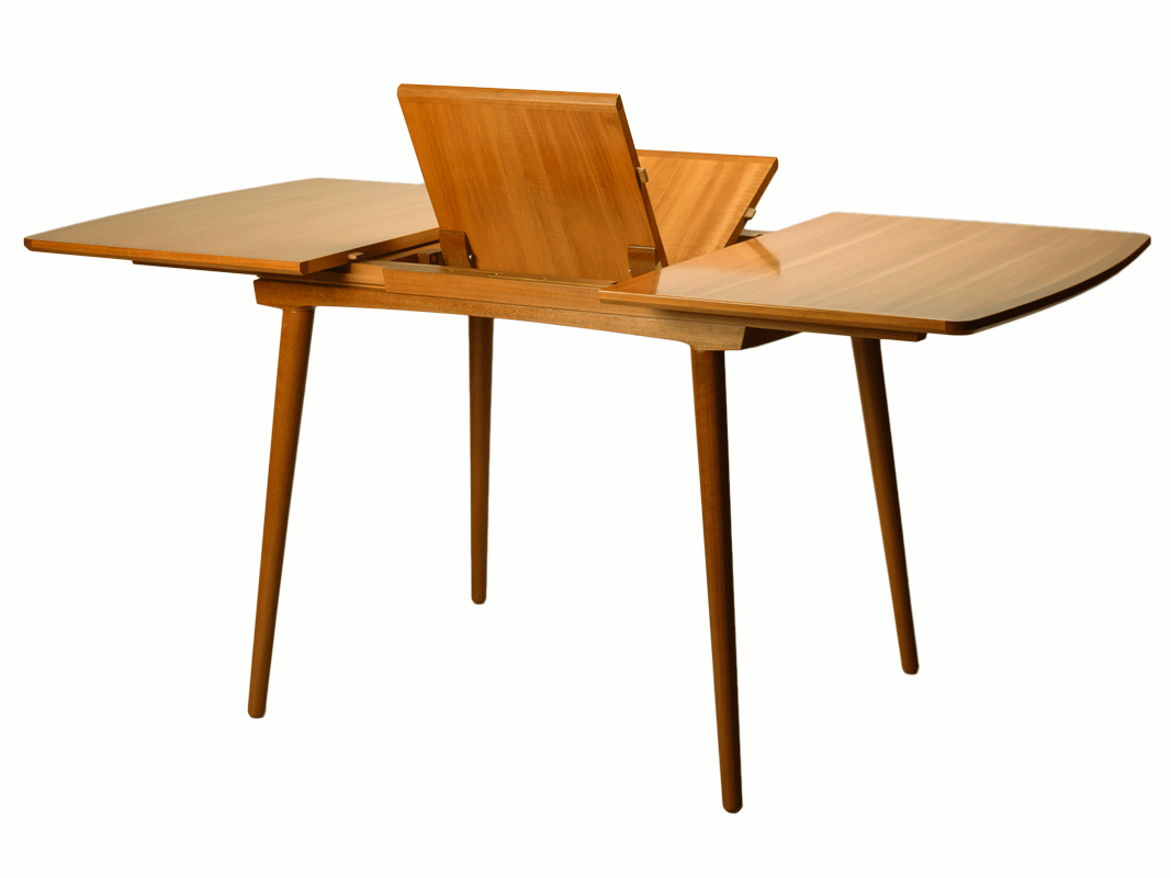 Many extension leaf tables are inconvenient to use. This table, with its butterfly-leaf mechanism and rack-and-pinion slides, simplifies the process, making it a very usable, everyday piece of fine furniture for small spaces. From a single position, one person can easily extend or close this table, and when not in use, the folded leaf is stored under the tabletop and protected from damage. The "Butterfly-Effect" dining table wears its convenience unobtrusively, seamlessly maintaining a smooth, rhythmic pattern of pearwood for 4 or 6 person meals.