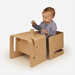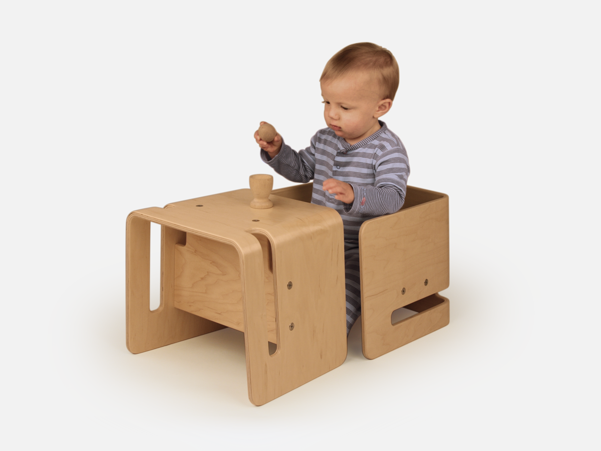 The Cu3e chair/table is a modern interpretation of a classic multi-use weening chair/table used in many Montessori programs. By merely flipping its orientation, Cu3e will accomodate a child's various activities and growing body. It can be a low infant chair, a medium-height toddler chair, a table on which to play or eat, an aid to standing, and even a stool for adults and children alike. Designed with smoothly rounded edges and a form free of pinch-points, and made of the highest quality CARB compliant birch plywood with a zero-voc clear finish, it is beautiful, strong, non-toxic and easy to clean and carry. Cu3e is safe by design and crafted to provide years of reliable service.I think you and your child will enjoy it as much we do!