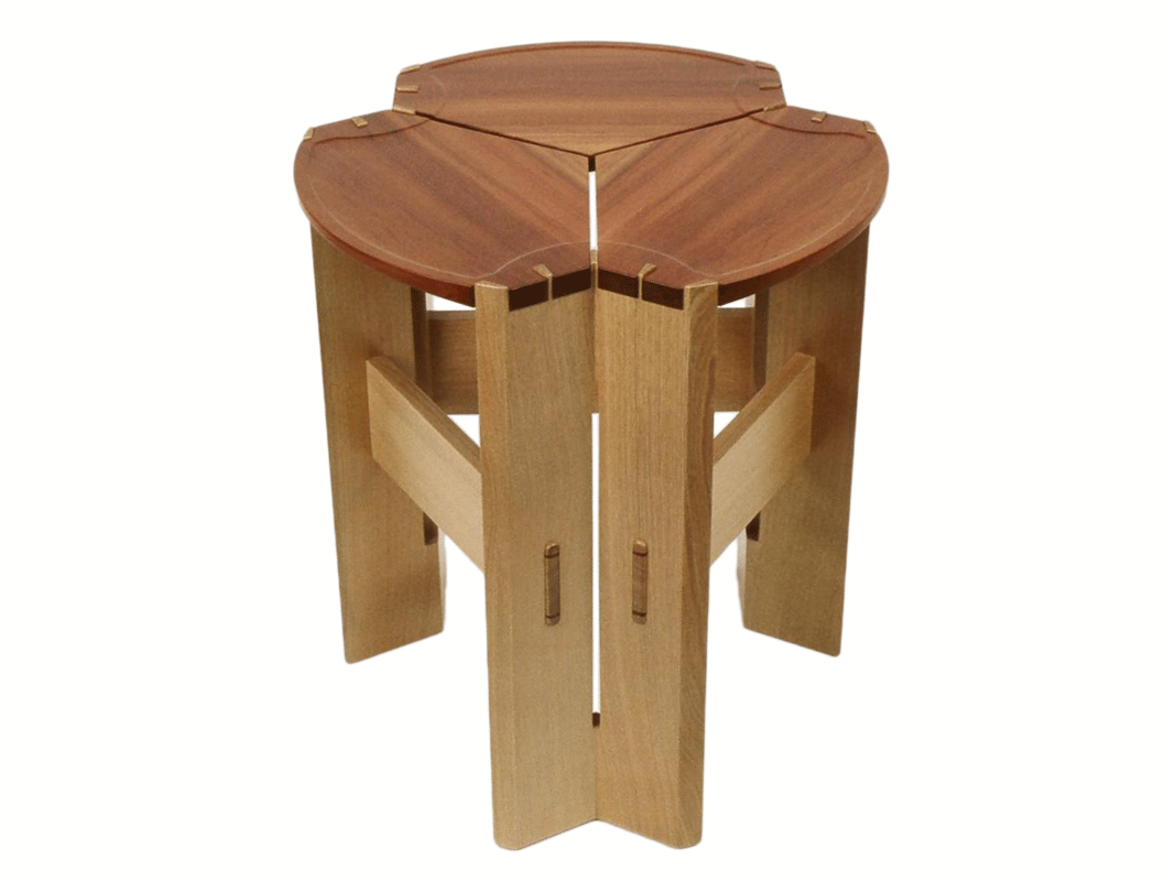 A small plant stand of a trefoil design, “Tray-Foliage” is derived from the “Tray-Foil” serving tray and is similarly made entirely of madrone. Here the exceptional beauty and variety of the wood is even more pronounced in its remarkable range of color. An incision along the length of each leg continues the floating motif of the three-part top and gives it a light, delicate character. For added stability the legs of the table are reinforced with wedged tenons, joints that once glued cannot be pulled apart.